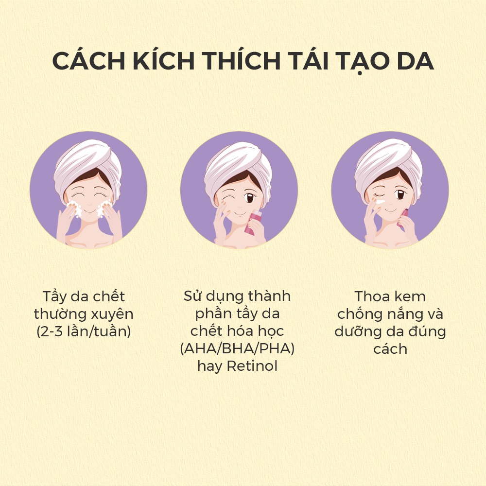 - Tẩy da chết thường xuyên để loại bỏ tế bào già cỗi trên bề mặt da (2-3 lần/tuần)